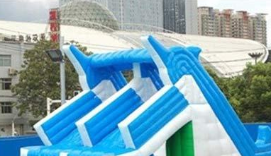 海豚充气滑梯采用可爱的海豚造型,其中设计两个滑道,可以链接不同尺寸支架游泳池,容纳更多小朋友同时互动嬉水。适合作为水上乐园设备。